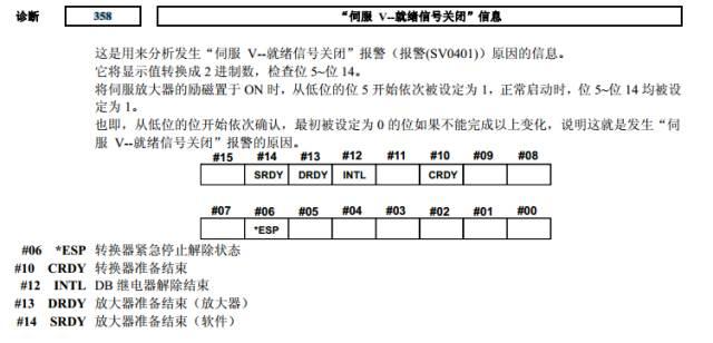 例如:診斷358=1441,轉(zhuǎn)換為二進(jìn)制為10110100001,從第5位開始排查,第6位為0,確認(rèn)首先應(yīng)排查急停相關(guān)接線等。